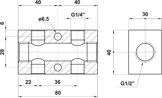 Collettore doppio 2 fori G1/4", foro passante G1/2"